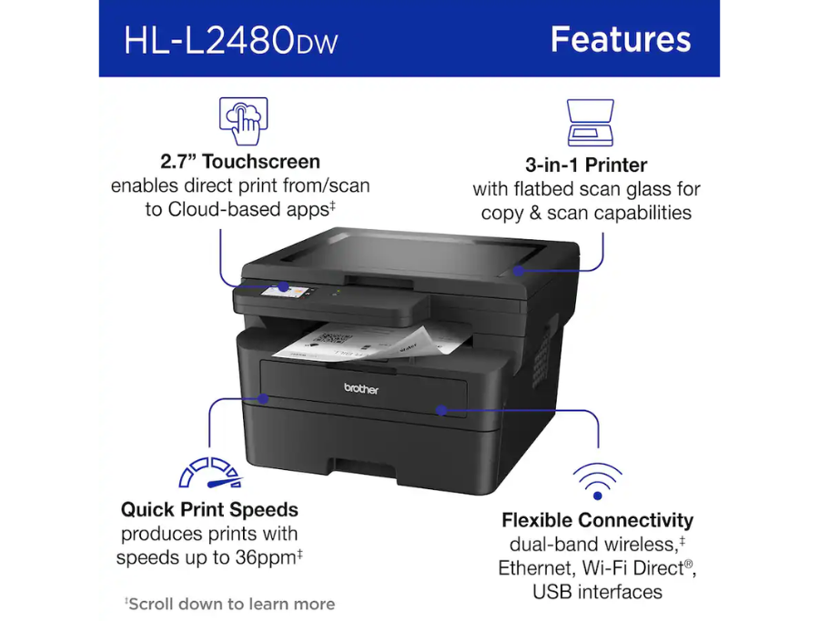 Efficient 3-in-1: Versatile printing, copying, and scanning in one compact unit.